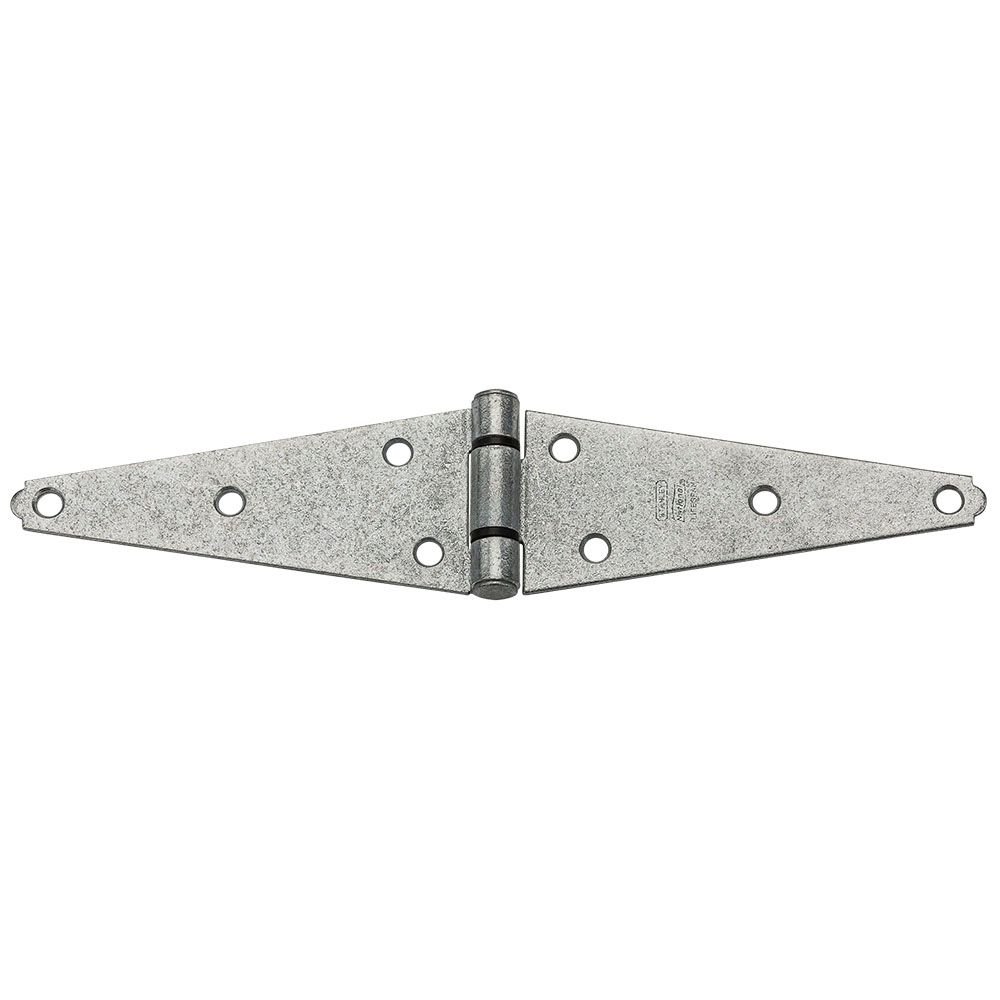 The National Hardware N128-322 282BC Heavy Strap Hinge is designed for various applications, including home, farm, builder, and industrial use. This hinge is constructed from hot-rolled steel and features a galvanized finish for enhanced corrosion resistance, particularly in environments with corrosive elements like salt air. Its design incorporates offset screw holes for increased strength and to prevent wood splitting, along with a tight pin suitable for both left and right-hand applications.