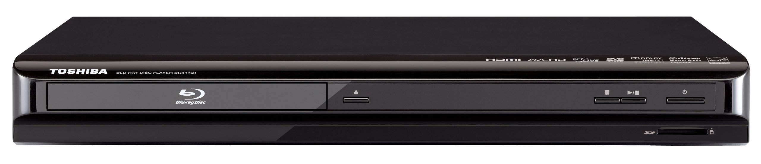 Obraz: Przód view of the Toshiba BDX1100 Blu-ray Disc Player, showing the disc tray, power button, and control buttons.