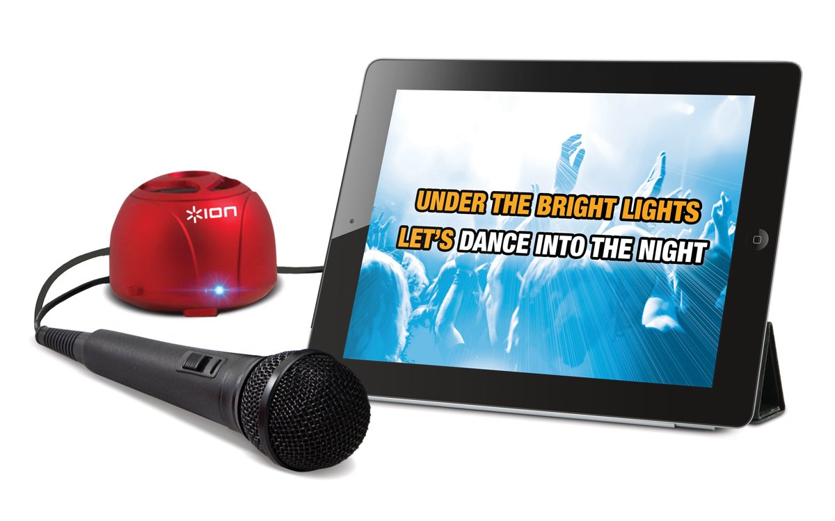 Image: The Ion KARAOKE2GO Karaoke 2 Go system, showing the compact speaker unit and the included microphone.