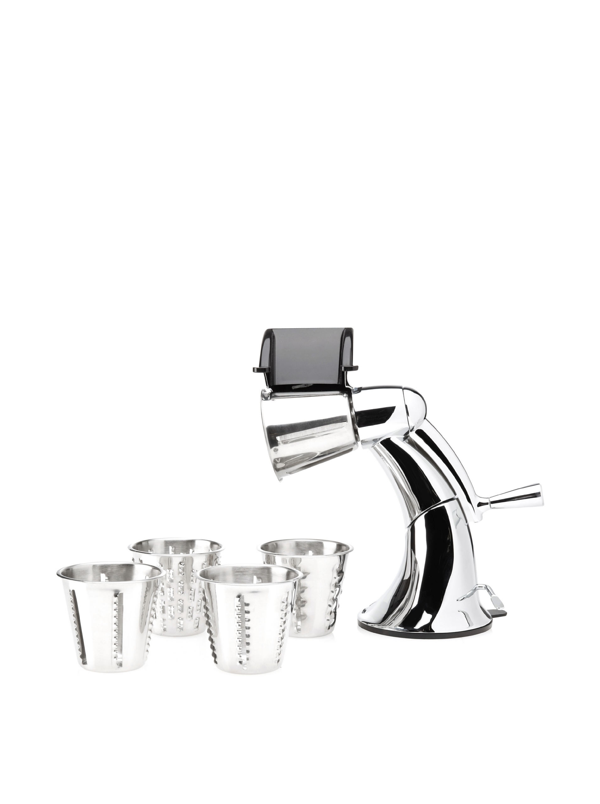 The five interchangeable stainless steel cones, each with a unique cutting pattern. Cone numbers are stamped on the bottom for identification.
