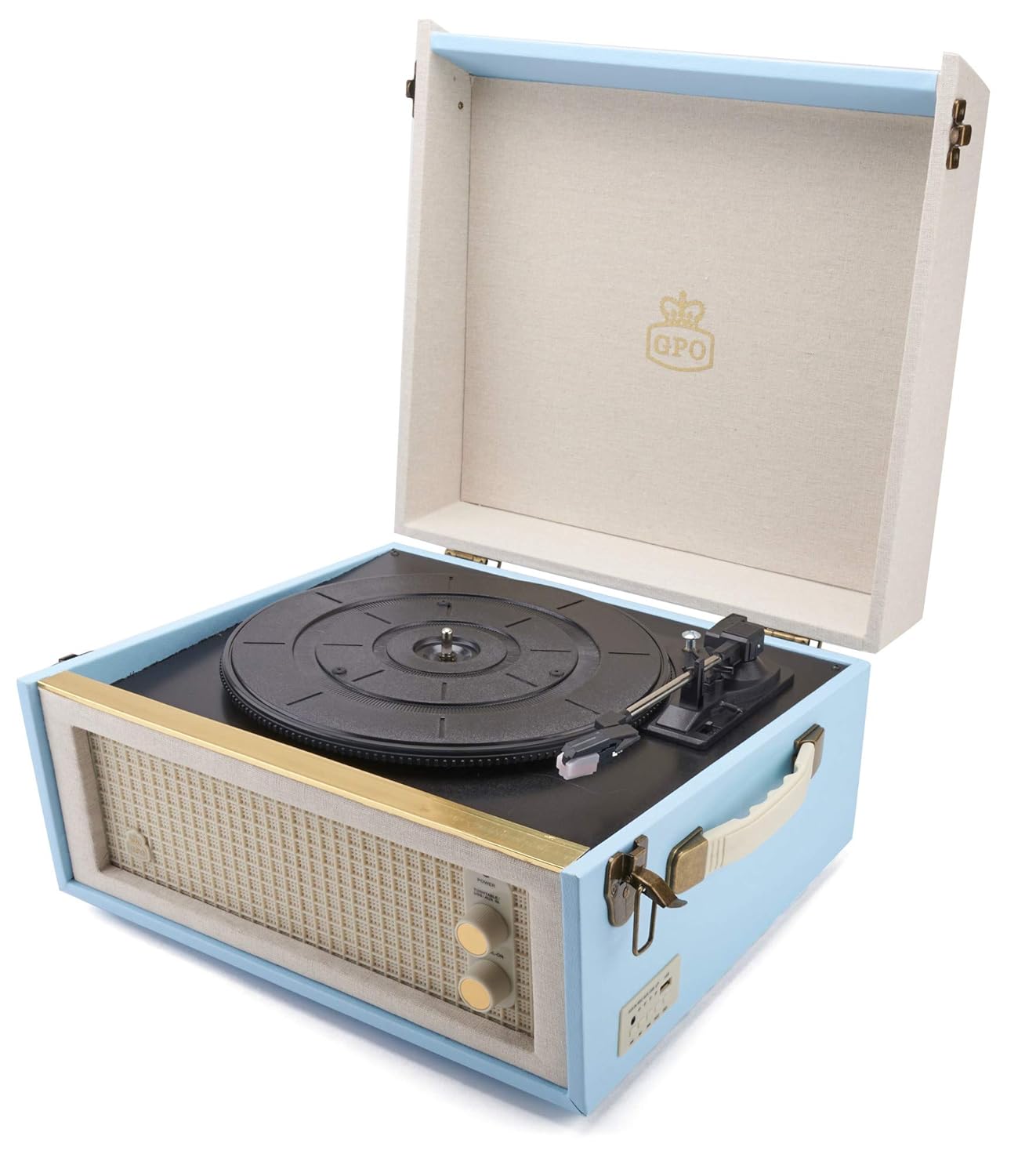 Image: The GPO Bermuda Classic Turntable with its lid open, revealing the record platter, tone arm, and stylus, ready for record playback.