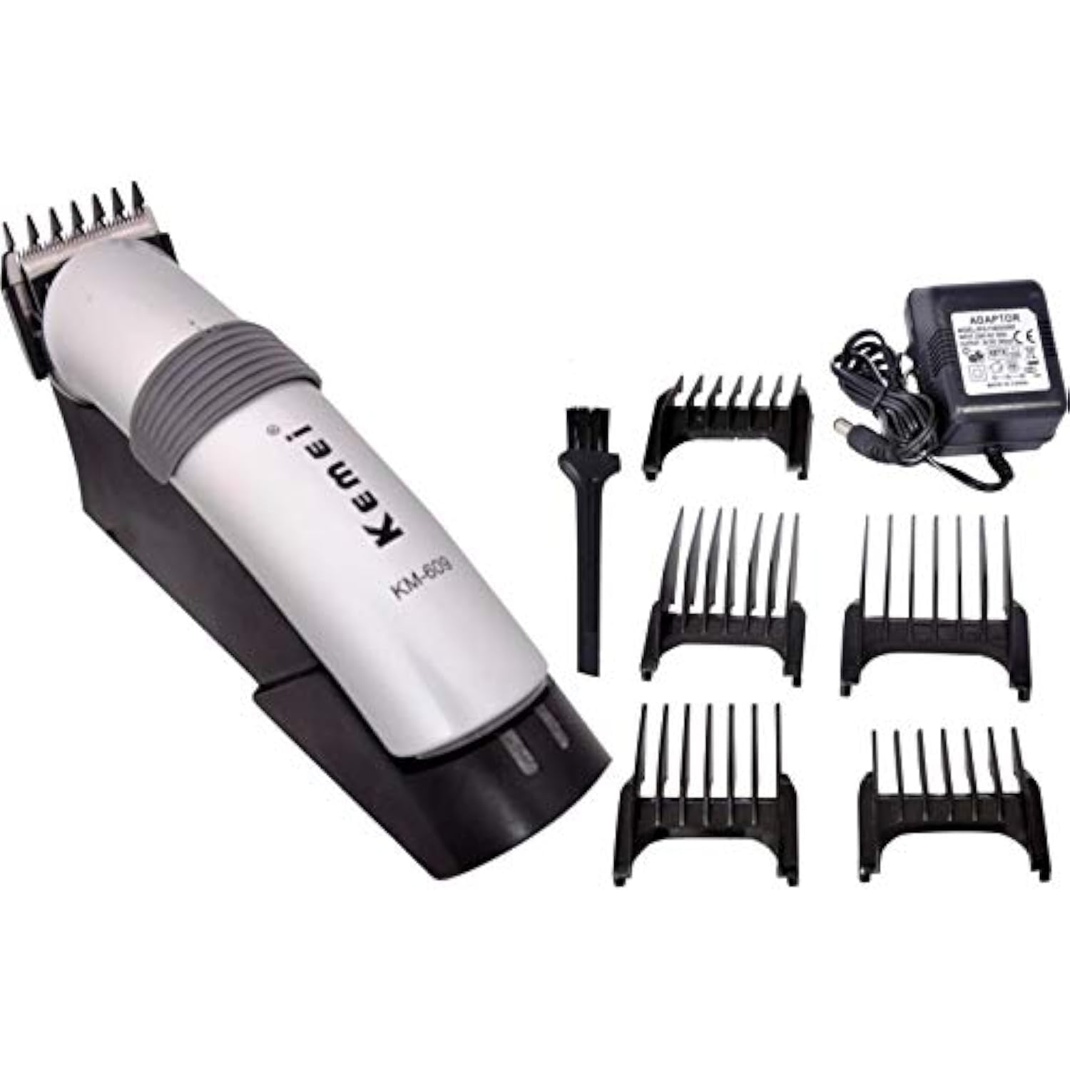 Image: KEMEI KM-609 shaver unit in its charging dock, accompanied by the power adapter and a selection of guide combs. A small cleaning brush is also visible.