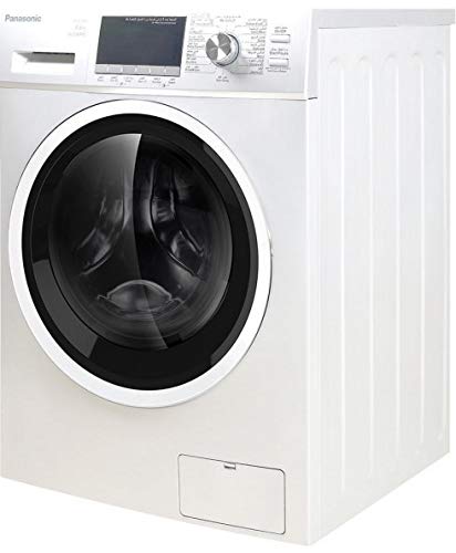 Rysunek 1: Pralka ładowana od przodu Panasonic NA-S085M1WSA. Na zdjęciu widać przód. view pralki z białą obudową, okrągłymi drzwiami z przednim załadunkiem oraz panelem sterowania z pokrętłem wyboru programu i wyświetlaczem cyfrowym umieszczonym na górze.