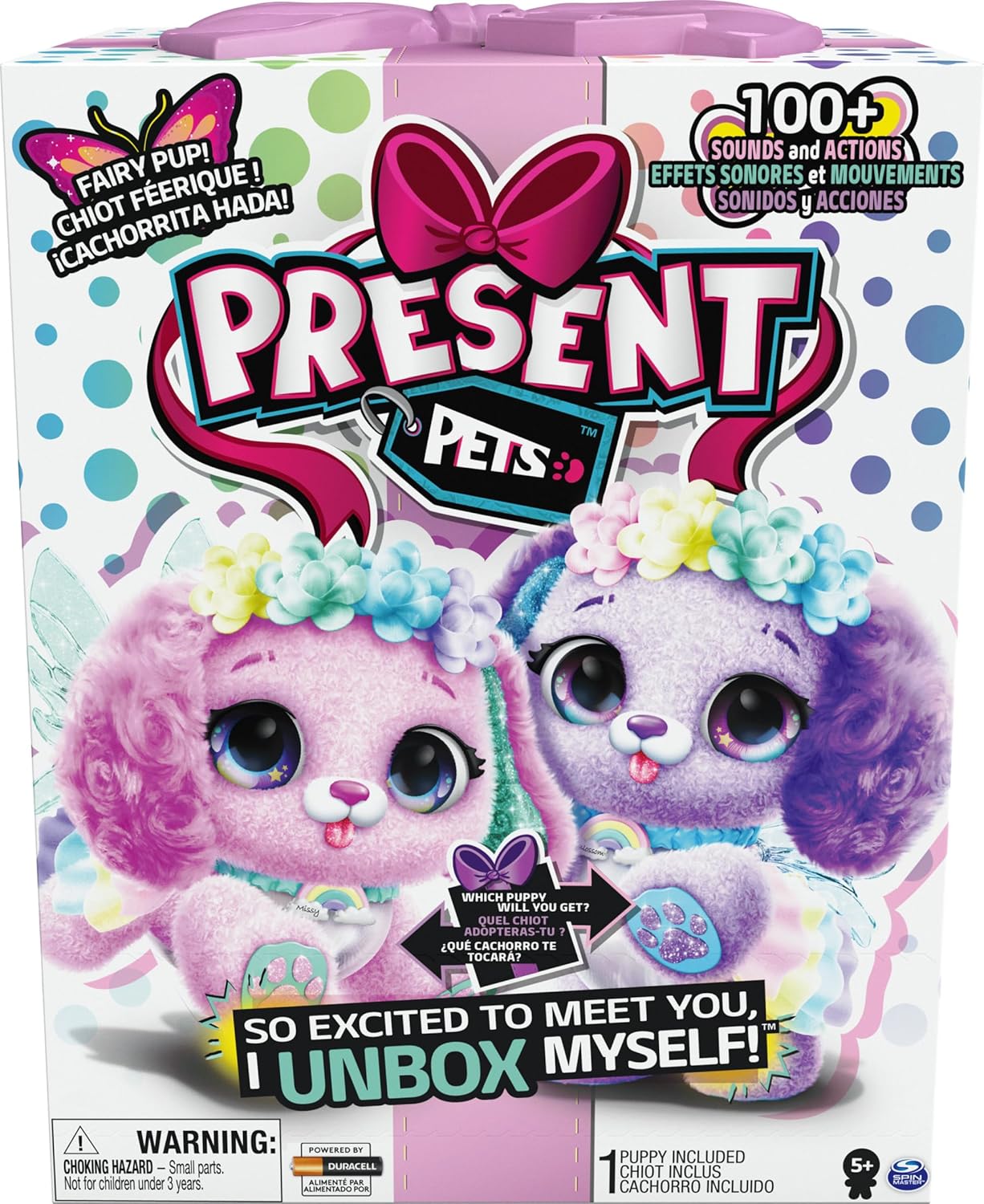 The Present Pets Fairy Puppy is an interactive plush toy designed to provide an engaging play experience. Each gift box contains one of two possible Fairy Pups: Missy or Blossom. These puppies feature over 100 sounds and actions, including self-unboxing, interactive responses to touch and voice, and two unique bark-back games.