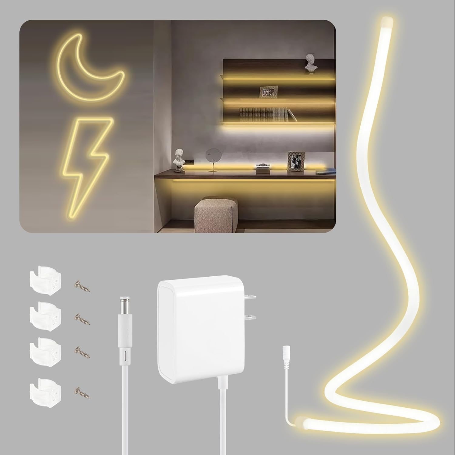 Image: Contents of the HOUHUI LED Neon Rope Light package, including the light strip, power adapter, and mounting hardware.