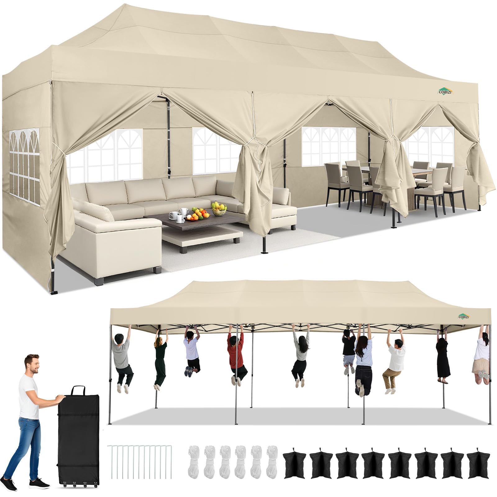The COBIZI 10x30 Pop Up Canopy, showcasing its full setup with sidewalls, and the included wheeled bag for transport.