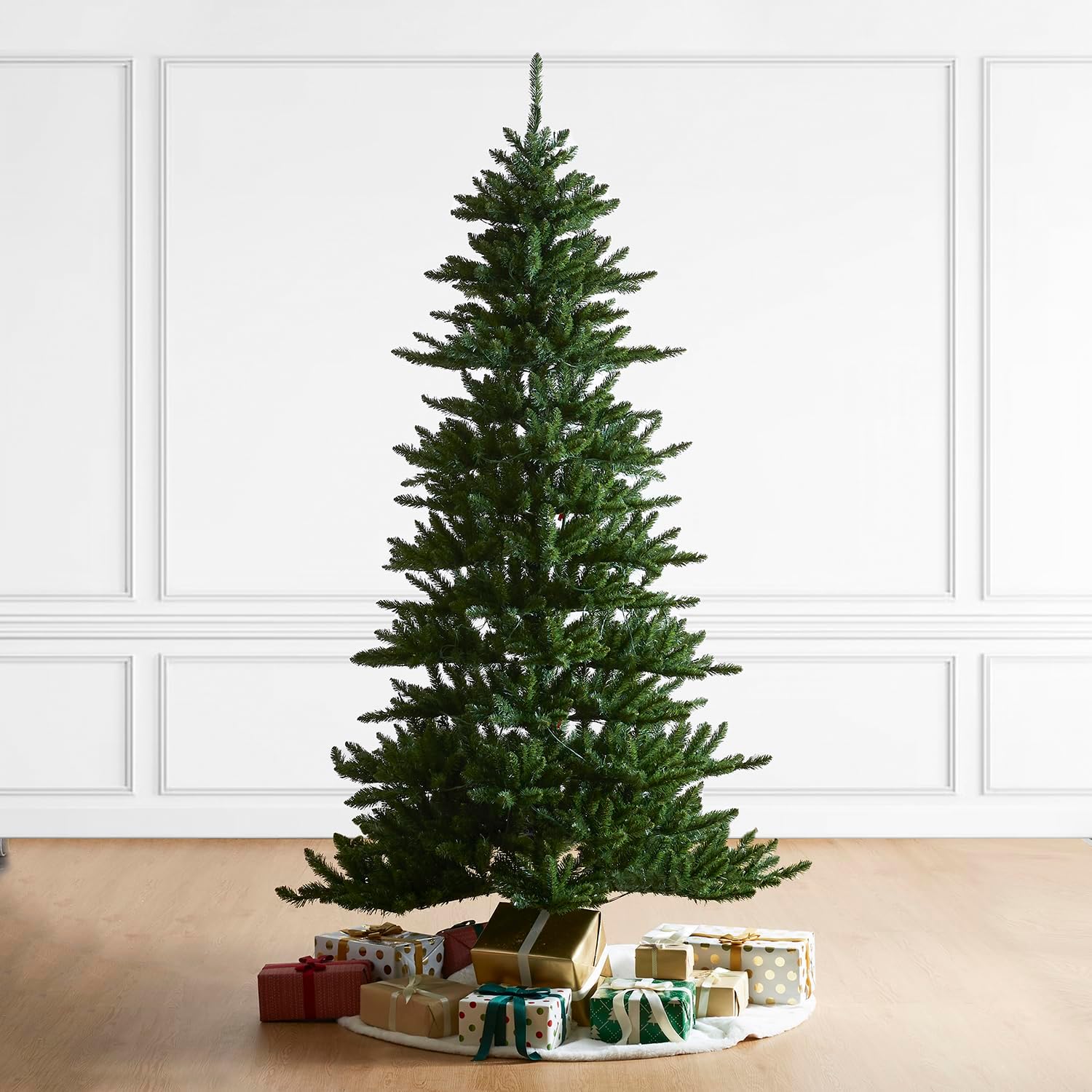 Image 1: The Glitzhome 7.5ft Prelit Artificial Christmas Tree, shown unlit with wrapped gifts around its base.