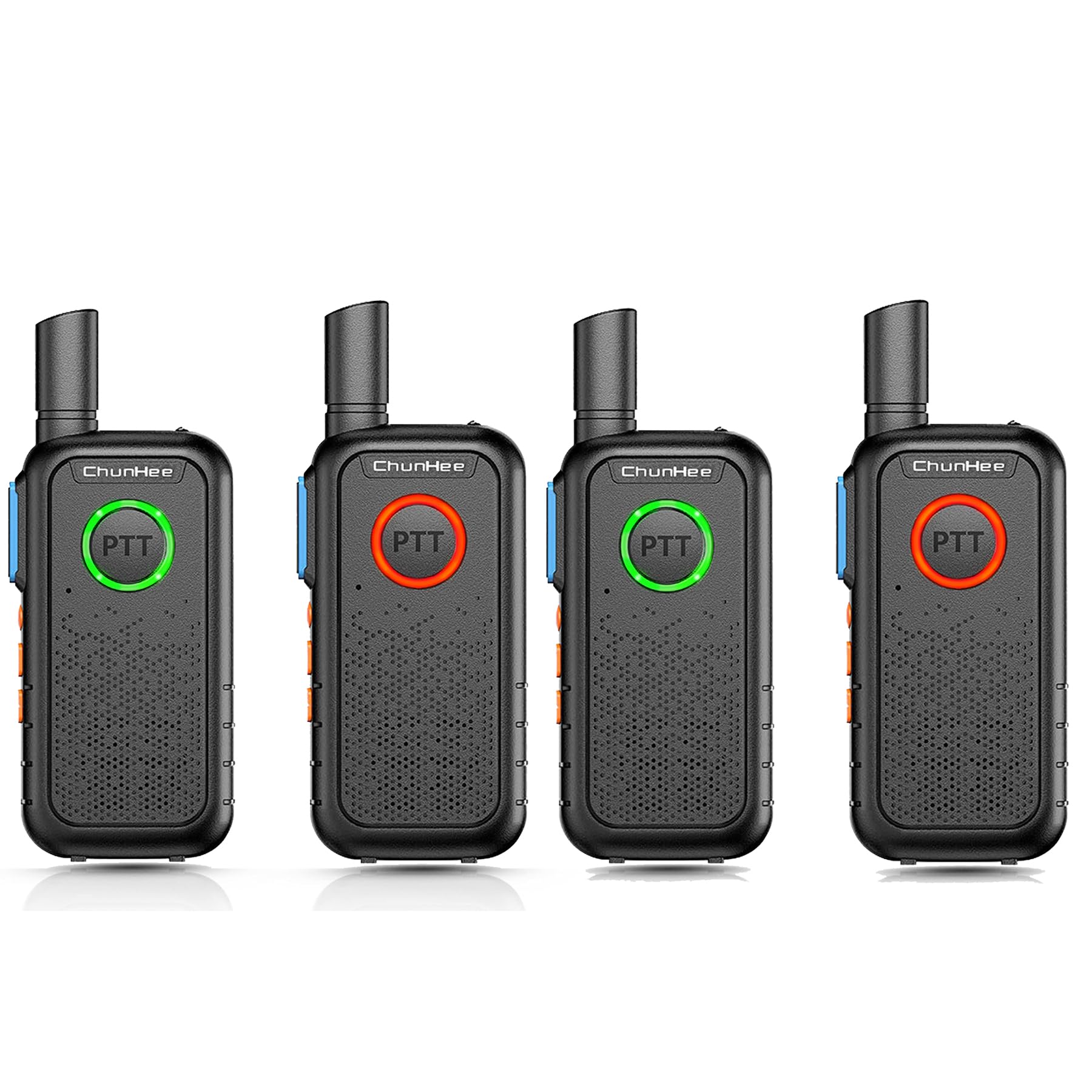 This image demonstrates the PTT button's light changing color to indicate communication status: green for receiving a signal and red for transmitting.