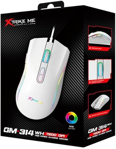 The Xtrike Me GM314 is a wired gaming mouse featuring a 7200 DPI optical sensor, 7 programmable buttons, and customizable RGB lighting, designed for personal computer use.