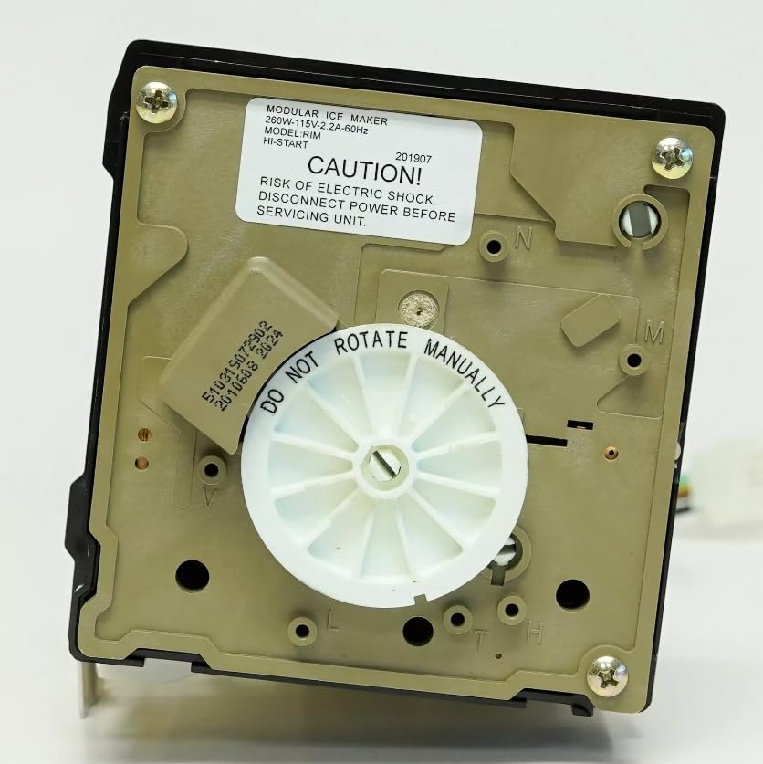 Obraz: Tył view of the ice maker assembly, showing the motor and a caution label warning against manual rotation and advising power disconnection before servicing.