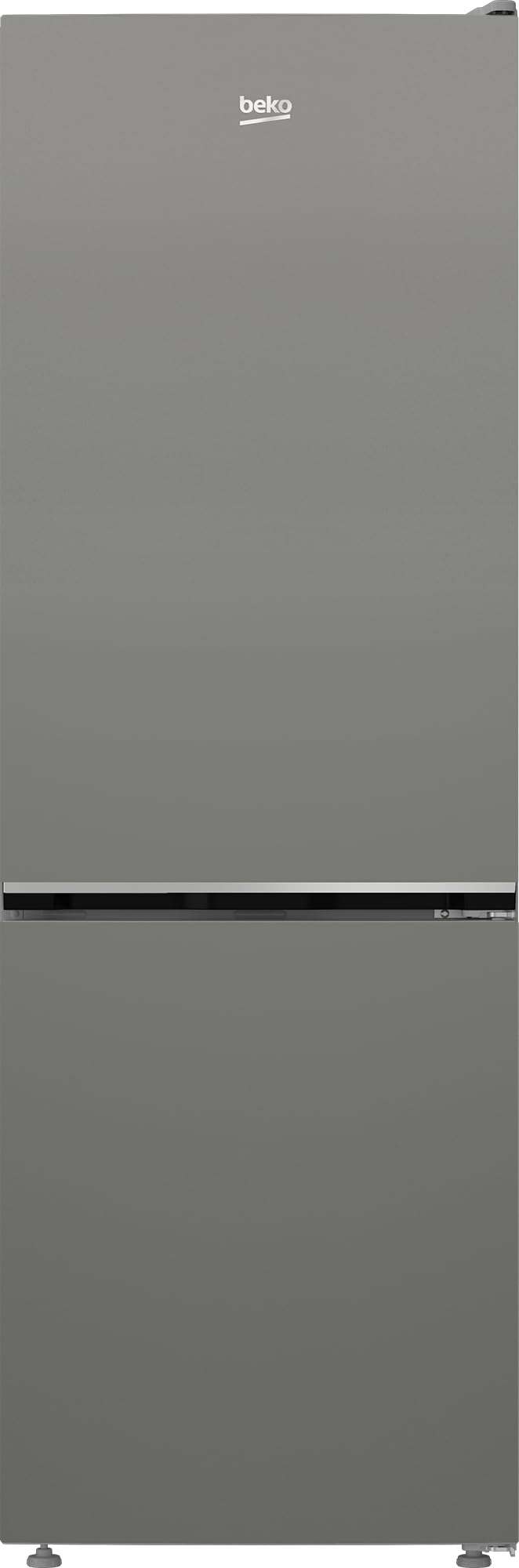 Rycina 1: Przód view of the Beko B5RCNA345HG2 Combined Refrigerator. The appliance is a tall, grey, metallic unit with two doors, the freezer compartment at the bottom and the refrigerator compartment at the top.